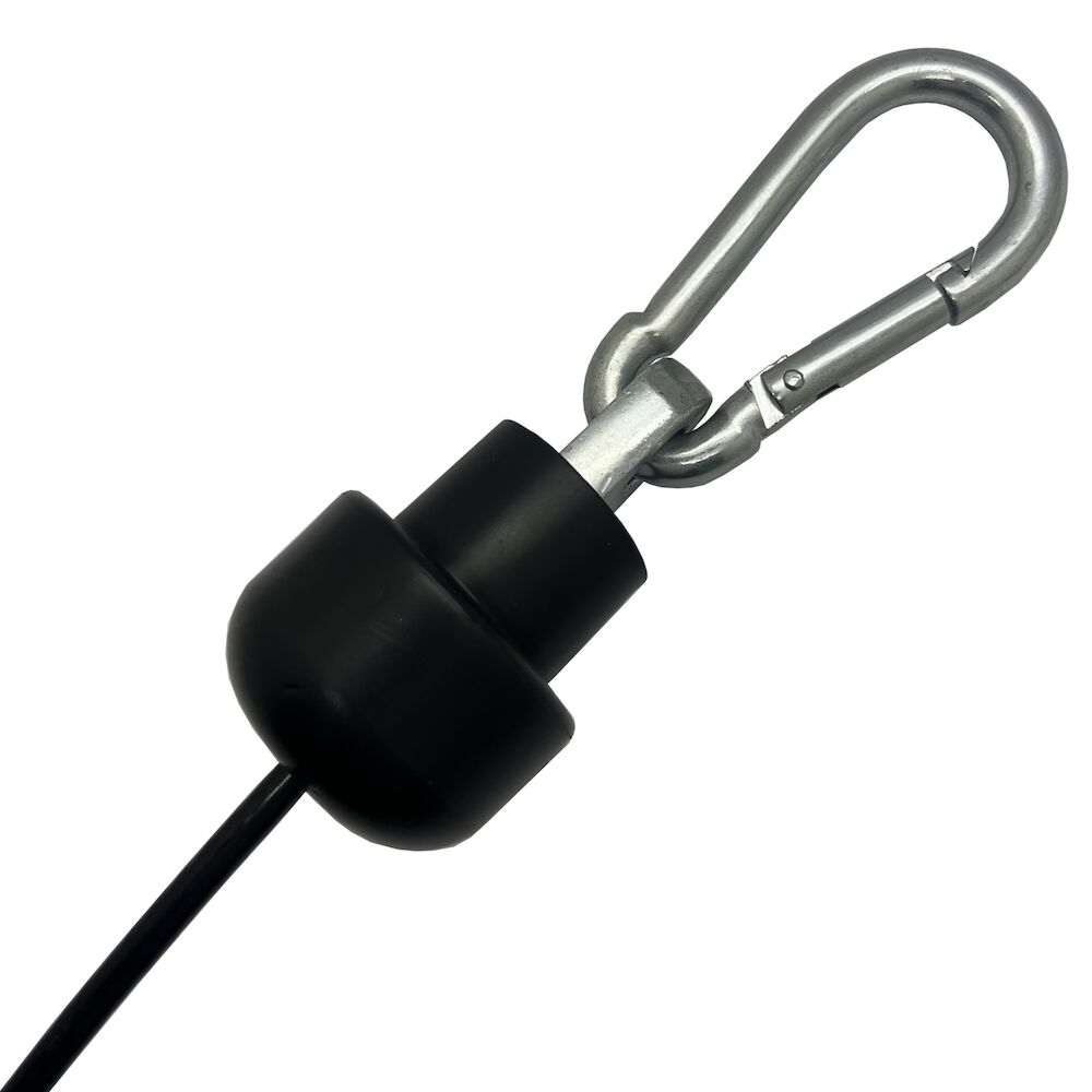 Easily attch this fitting to your gym cable by tightening down the 4 grub screws, we recommend stripping the coating fitting this end directly onto the steel wire rope, it comes with a 80mm length snap hook
