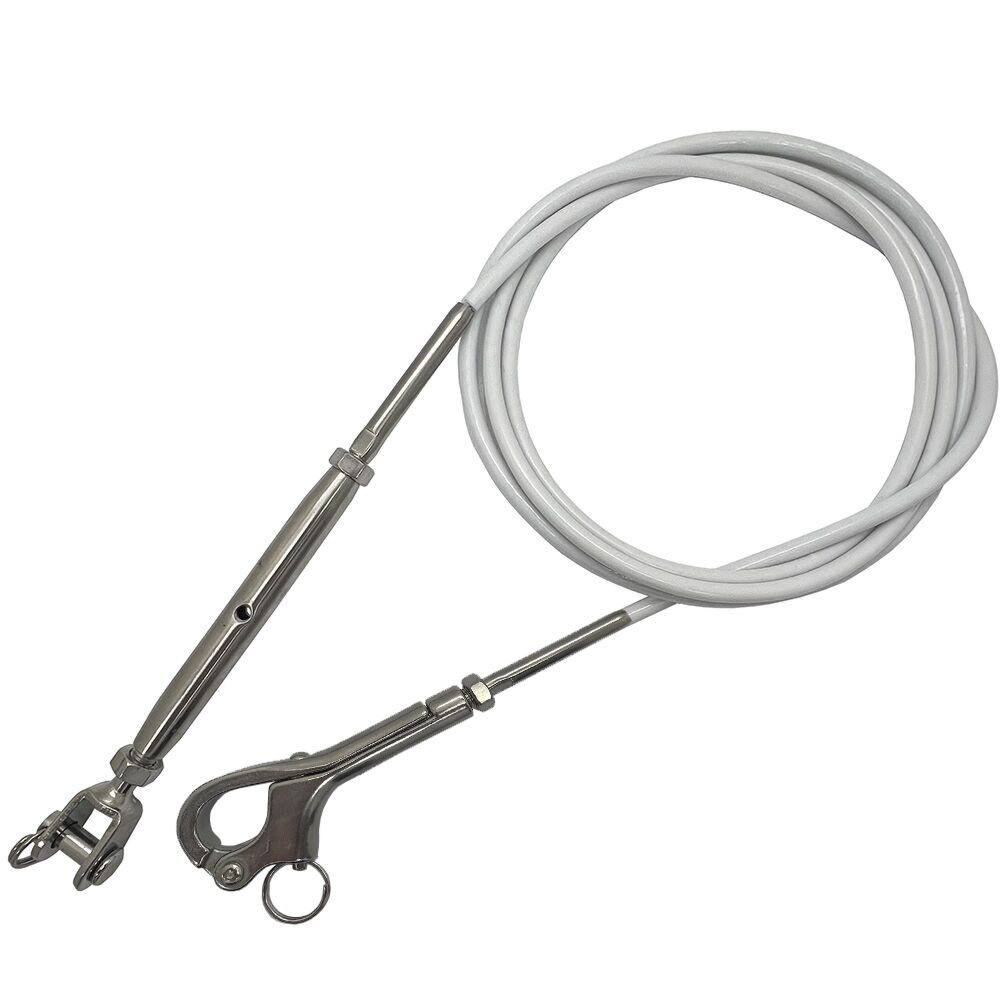 Comes fitted with a rigging screw swage / jaw and a M8 swage stud fitting with a quick release pelican hook for fast and easy attachment