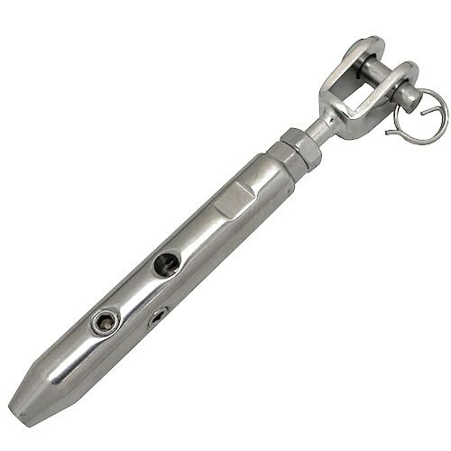 This fitting can be used with 3mm and 4mm diameter steel wire ropes, easily attach to steel wire rope by simply tightening down the grub screws, they offer approx 30mm of tensioning as you can screw out the jaw and use the locking nuts to secure in place