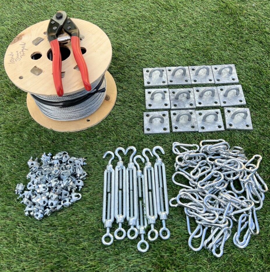 This handy kit comes with all the fittings and wire rope that you will need to suspend your sports netting. Can be used with all sports netting such as batting cages, football pitch net dividers, cricket netting... pretty much any application where you want to create a line from strong steel wire rope to suspend netting