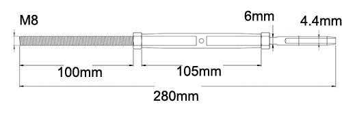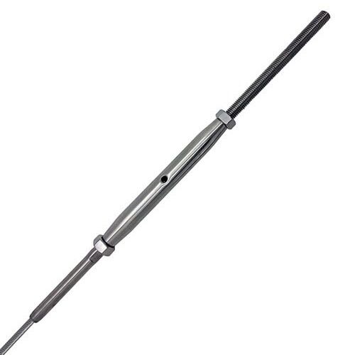 This rigging screw accepts 4mm diameter steel wire rope and comes with a M8 right handed threaded stud end, this is suitable for balustrade systems with steel posts